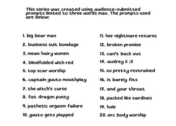 The first collection of illustrations from an ongoing series, where I take audience suggested prompts of three words or less. This first volume contains the first 20, full color, erotic illustrations, bound into a nice PDF. Includes works previously exclusive to my SubscribeStar <3